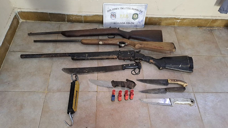 En la finca se secuestraron armas de fuego calibre 22, una escopeta de fabricación casera calibre 12, cartuchos de diferentes calibres, cuchillas de distintos tamaños, cuero de animal vacuno con el pelaje coincidente al denunciado, presentando estado fresco en su grasa y carne, como así también quemado y una balanza tipo romana.