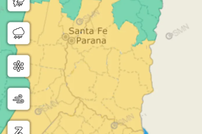 La alerta del SMN abarca gran parte del territorio provincial, incluyendo los departamentos La Paz, Villaguay, Paraná, Diamante, Victoria, Gualeguay, Islas del Ibicuy, Nogoyá, Tala, Uruguay y Colón.