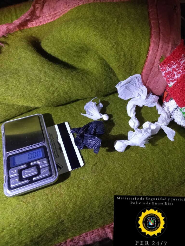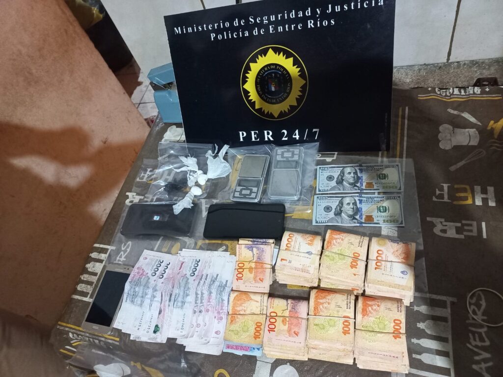 Gracias a la intervención del Fiscal Dr. Alejandro Perroud y la autorización del Juzgado de Garantías local, se ejecutó el allanamiento y registro domiciliario, lográndose incautar una considerable cantidad de estupefacientes, entre ellos clorhidrato de cocaína y marihuana prensada, así como otros elementos relacionados al narcomenudeo. También dinero en efectivo en dólares estadounidenses, pesos argentinos, tres teléfonos celulares, balanzas de precisión y varios recortes.