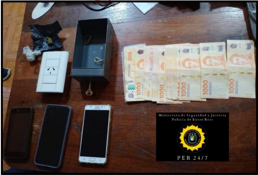 En tanto, en una vivienda de calle Pronunciamiento, en Paraná, personal de la Dirección Toxicología y Cuerpo de Operaciones Especiales, detuvieron a un hombre, identificaron a una mujer y secuestraron envoltorios conteniendo marihuana y Clorhidrato de Cocaína, dinero en efectivo, equipos de telefonía celular y una caja fuerte.