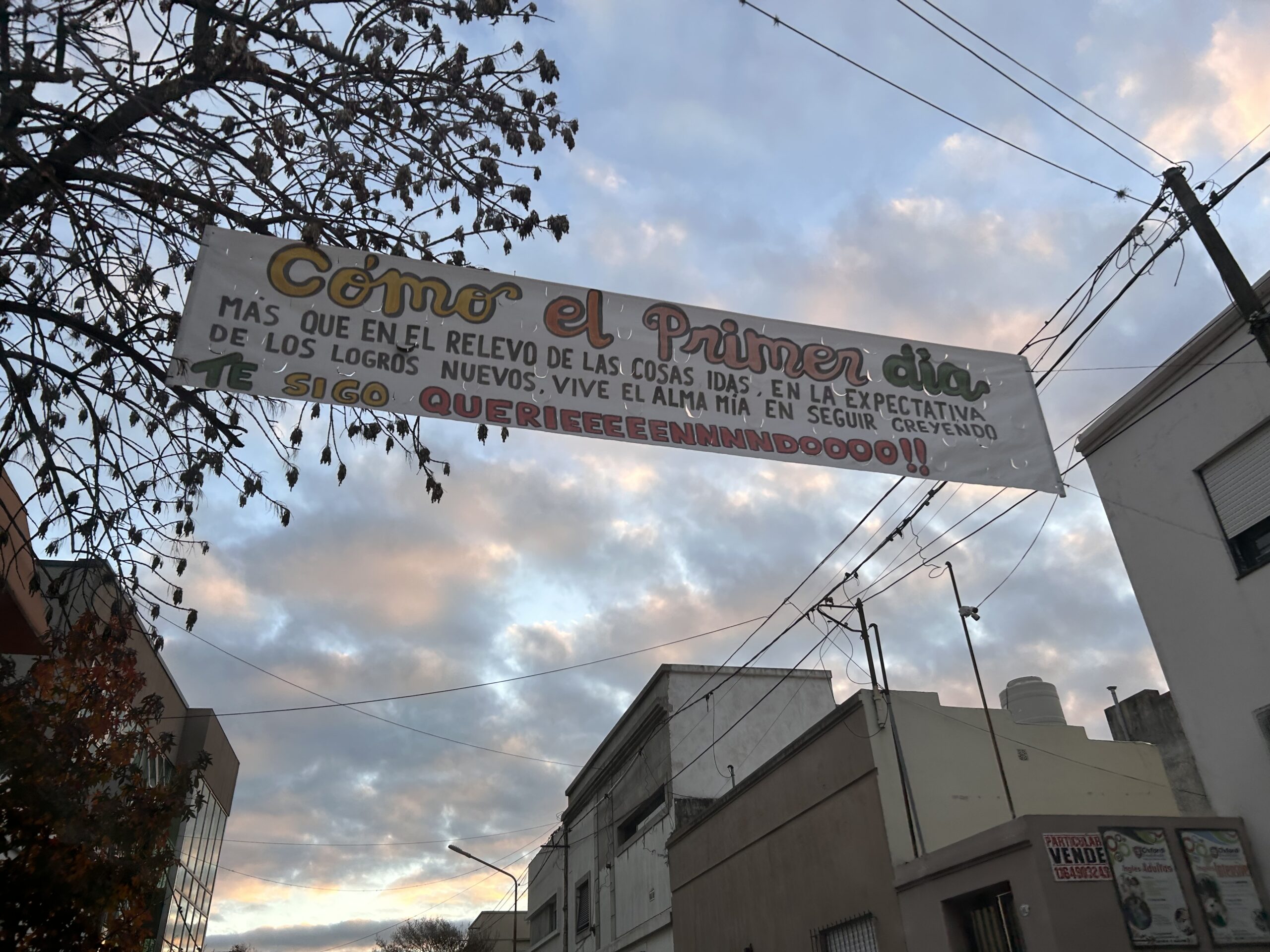 Un pasacalles con una peculiar frase apareció colgado en la intersección de Sarmiento y Juan Perón. En él se puede leer «Como el primer día, más que en el relevo de las cosas idas, en la expectativa de los logros nuevos, vive el alma mía, en seguir creyendo te sigo querieeeeeeennnnnddoooooooo!!».