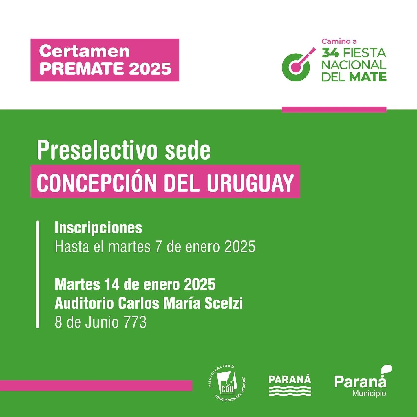 El Premate forma parte de la antesala de la 34ª Fiesta Nacional del Mate, que tendrá lugar los días 7 y 8 de febrero y contará con la presentación de Babasónicos, El Kuelgue, Juan Fuentes, Luciano Pereyra, Luck Ra y Zoe Gotusso, además de Cauce Litoral-Ensamble Joven y los ganadores del Premate.