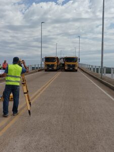 El ingeniero Juan Carlos Draper, Inspector de Obra contratado por CARU, explicó los alcances de estas pruebas que consisten en colocar, en lugares estratégicos, cinco camiones cargados previamente pesados para tomar una medición de variación de niveles por efecto de los camiones: “a través de este método, y otros más directos complementarios se evalúan constantes de elasticidad del puente, por ejemplo y otra serie de parámetros. Es un complemento de los ensayos en el marco de esta inspección principal de los puentes que se está haciendo”.