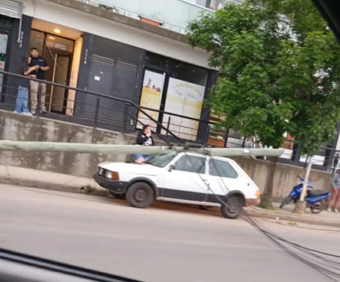 Personal de Bomberos Voluntarios trabajan en Balbín y Avenida Ravena por la caída de cables y de un poste, de una compañía telefónica, sobre un automóvil. En ese sentido, la intersección se encuentra cerrada al tránsito para facilitar las labores.