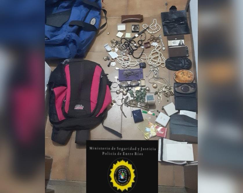 Ya en el lugar los uniformados encuentran a una mujer de 27 años, escondida detrás de un muro en la vivienda, y además visualizan que una de las ventanas del frente se encontraba dañada, hallando en su interior a un hombre también de 27 años, quien tenía en su poder dos bolsos con varios elementos que fueron formalmente secuestrados.
