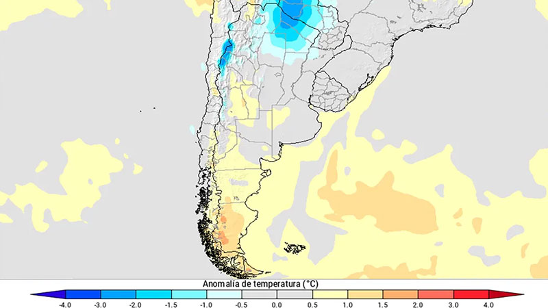 Por otro lado, la mayor influencia de un evento El Niño durante el final del otoño y el comienzo del invierno sobre Argentina se observa en la variable de la temperatura. Este parámetro sí tiene una correlación significativa durante el trimestre del invierno y el último tramo del otoño, y la mayor parte del país muestra una característica de temperatura superior a lo normal.