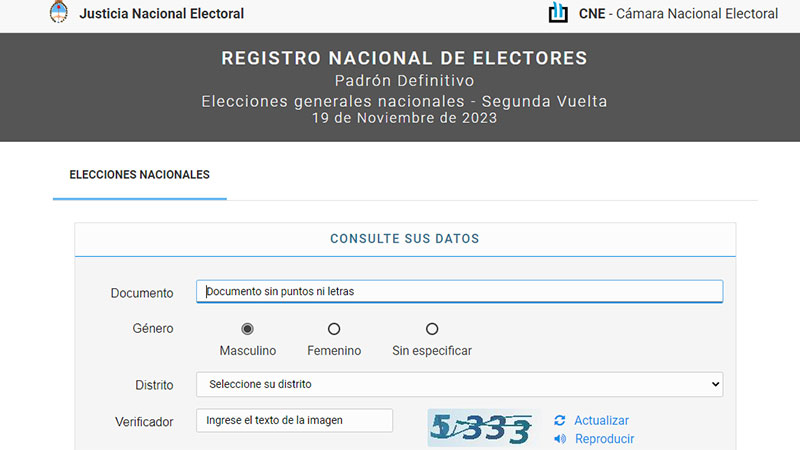 La Cámara Nacional Electoral (CNE) tiene publicado el padrón definitivo para que los ciudadanos puedan ver en qué establecimiento y mesa les tocó a los ciudadanos para votar este domingo 19 de noviembre en el balotaje presidencial.