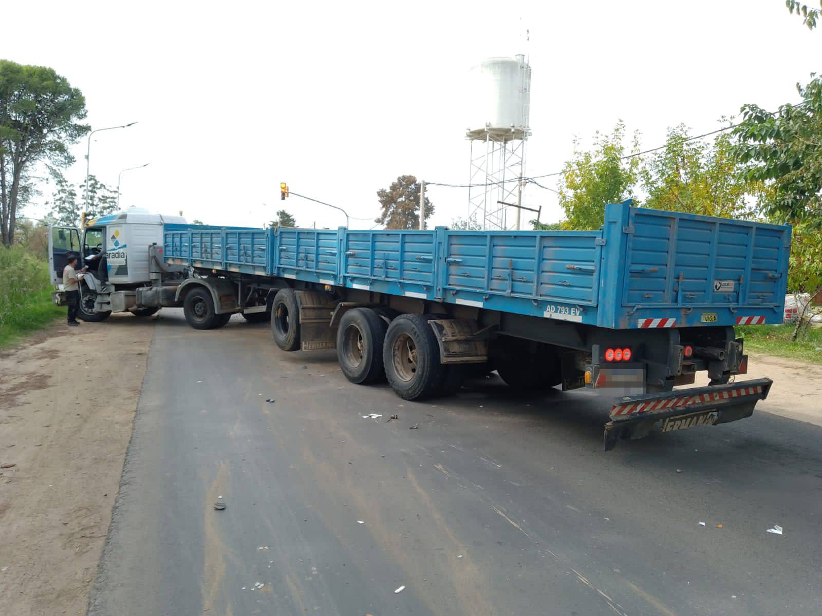 En el mediodía de este lunes, dos camiones con acoplado chocaron en el ingreso a la ciudad, en calle Rodríguez Artusi, a metros de AReNe y frente a la Escuela N° 118 La Capitana Remedio del Valle.