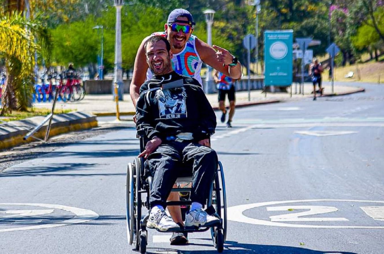 Mauro Sarubi tiene 32 años, es oriundo de La Paz y actualmente reside en Paraná. Tiene una parálisis motriz espastica distónica por hipoxia. Es muy común verlo haciendo actividad deportiva en la costanera de la capital provincial, junto a su amigo Marcos Gómez, con quien participa de maratones pedestres con una silla de ruedas estándar y ahora están juntando apoyo para adquirir una silla de arrastre, adecuada para la actividad, y que cuesta $2 millones.