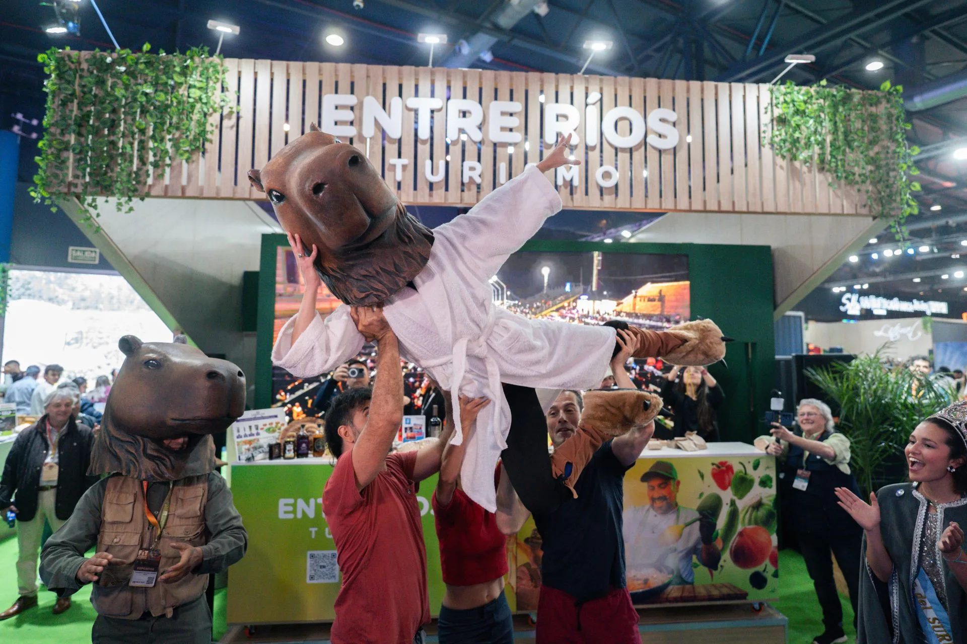 El Modo Carpincho fue el gran llamador de la primera jornada. Las mascotas recorrieron el predio invitando a posar para fotos, improvisando bailes y generando un clima distendido que se volvió la marca de Entre Ríos en la feria. Su presencia espontánea y lúdica convirtió cada aparición en un foco de atención, multiplicando la interacción en redes sociales y atrayendo constantemente público al stand entrerriano.