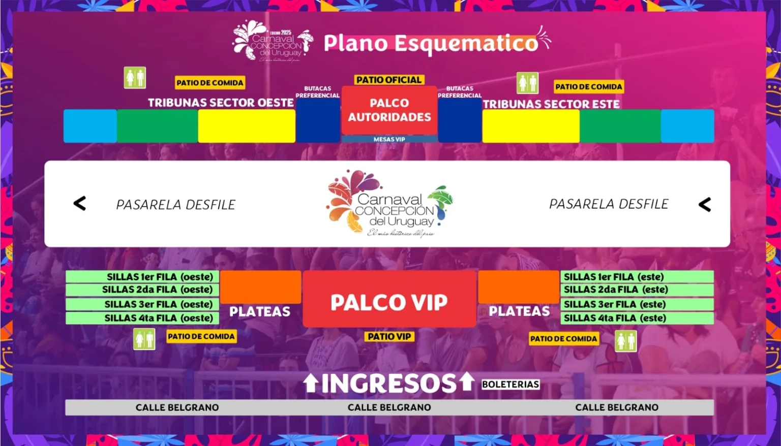 La Comisión Organizadora del Carnaval de Concepción del Uruguay difundió el precio de las entradas anticipadas y las ubicaciones para las noches del 8, 15 y 22 de febrero y el 1 y 3 de marzo. La venta comenzará este en la boletería del Predio Multieventos de 19:00 a 22:00.