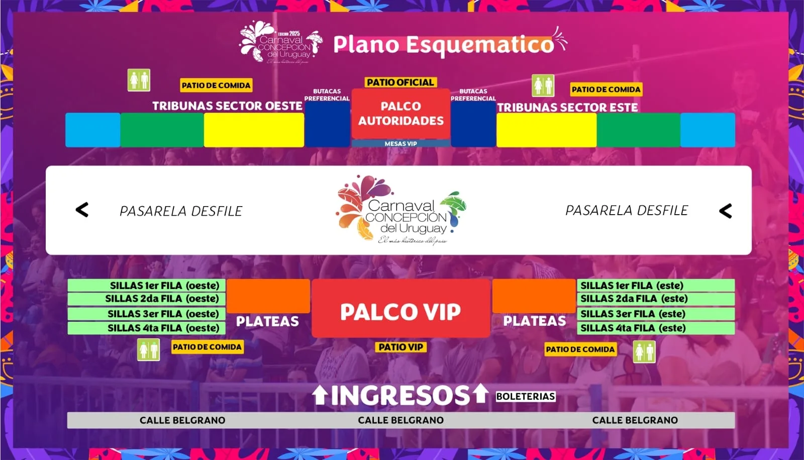La Comisión Organizadora del Carnaval de Concepción del Uruguay difundió el precio de las entradas anticipadas y las ubicaciones para las noches del 8, 15 y 22 de febrero y el 1 y 3 de marzo. La venta comenzará el lunes 3 en la boletería del Predio Multieventos de 19:00 a 22:00.