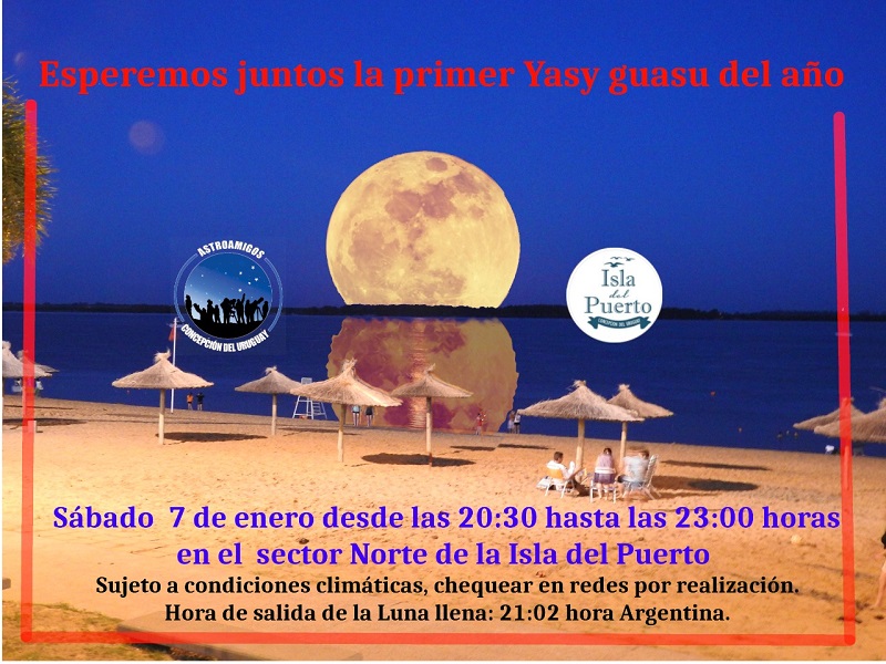 Este sábado 7 de enero se podrá observar la Luna que estará en su fase llena y por eso Astroamigos Concepción del Uruguay, la Municipalidad e Isla del Puerto invitan a observar la salida a las 21.02.