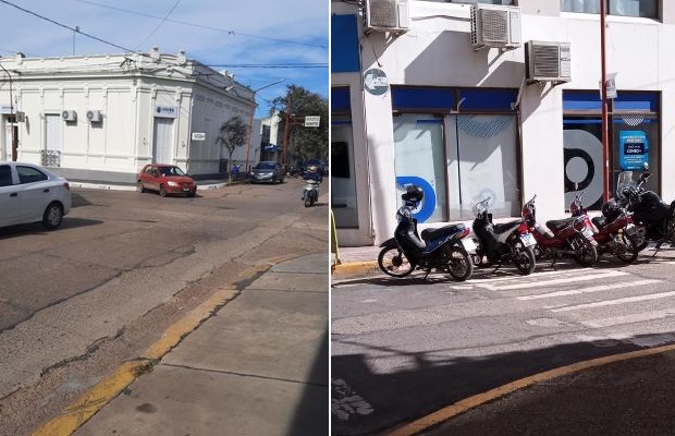 Nadie respeta los estacionamientos de motos y los sectores demarcados para que puedan doblar los colectivos, lo que dificulta la circulación vehicular.