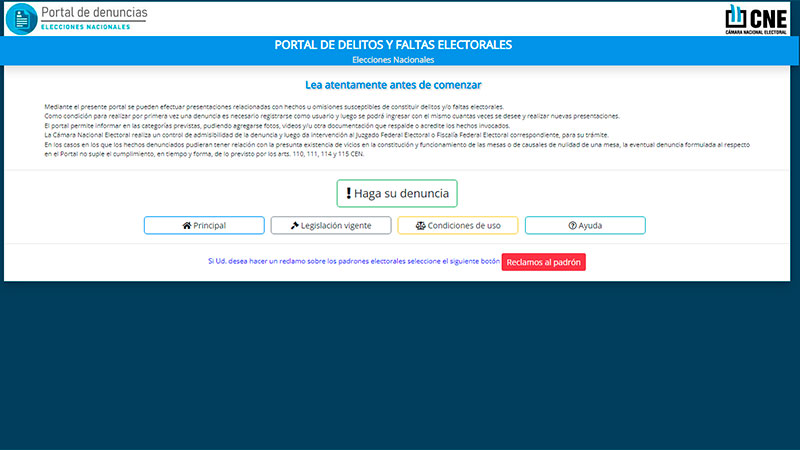 El portal web de denuncias para delitos y faltas electorales es www.padron.gov.ar/cne_denuncias/ y permite a la ciudadanía «realizar denuncias sobre hechos u omisiones susceptibles de constituir delitos y/o faltas electorales (por ejemplo, dificultad o impedimento para el transporte de urnas o documentos electorales, falsificación de documentación electoral, impedimento o para ejercer cargos electorales», informó la máxima autoridad judicial electoral del país en un comunicado.