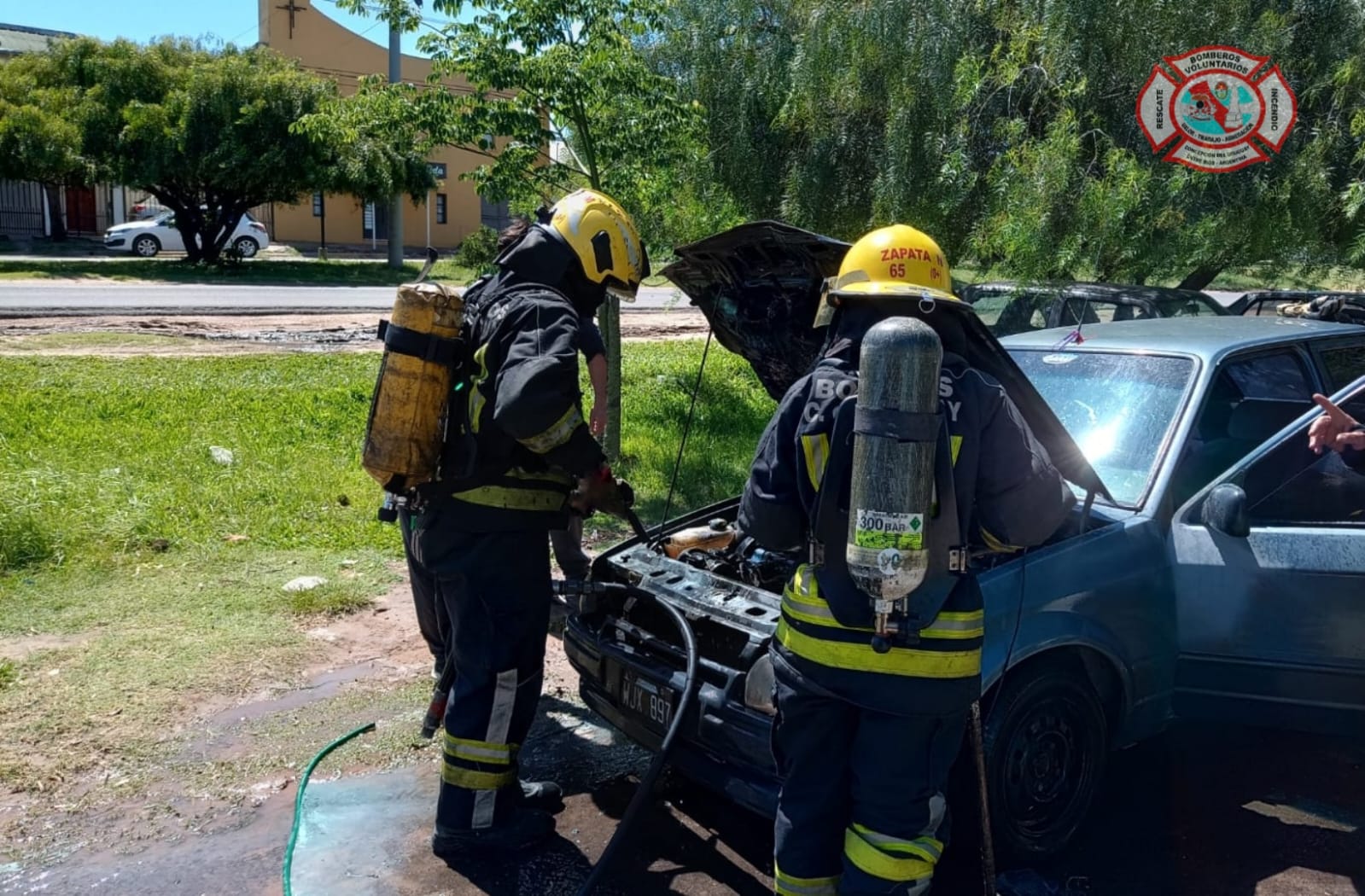 Al llegar al sitio, se constató que el incendio ya había sido sofocado con un matafuego. Se procedió a establecer un perímetro de seguridad y se inició el enfriamiento del vehículo afectado utilizando una línea devanadera, trabajando hasta lograr su extinción total.