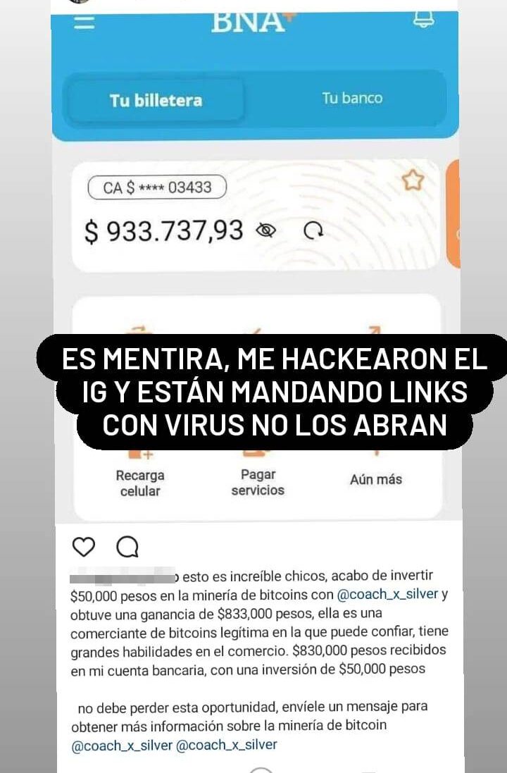 Sin embargo, un desconocido realizó ese procedimiento de antemano, cambió la clave y el mail de respaldo. Luego de ello, enviaron un mensaje a todos sus contactos, ofreciendo la compra de Bitcoin e inversiones, a través de un link.