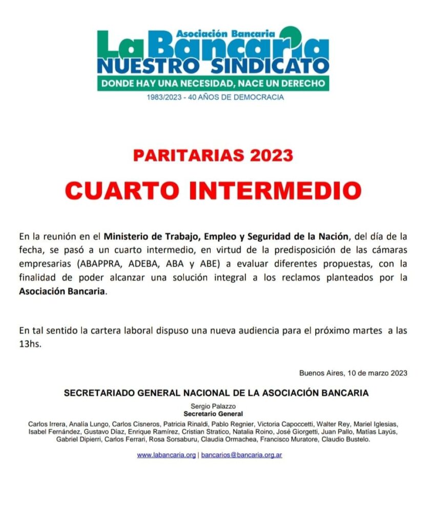 Desde la Asociación Bancaria informaron que la reunión con el Ministerio de Trabajo, Empleo y Seguridad de la Nación llevada a cabo este viernes, pasó a un cuarto intermedio.