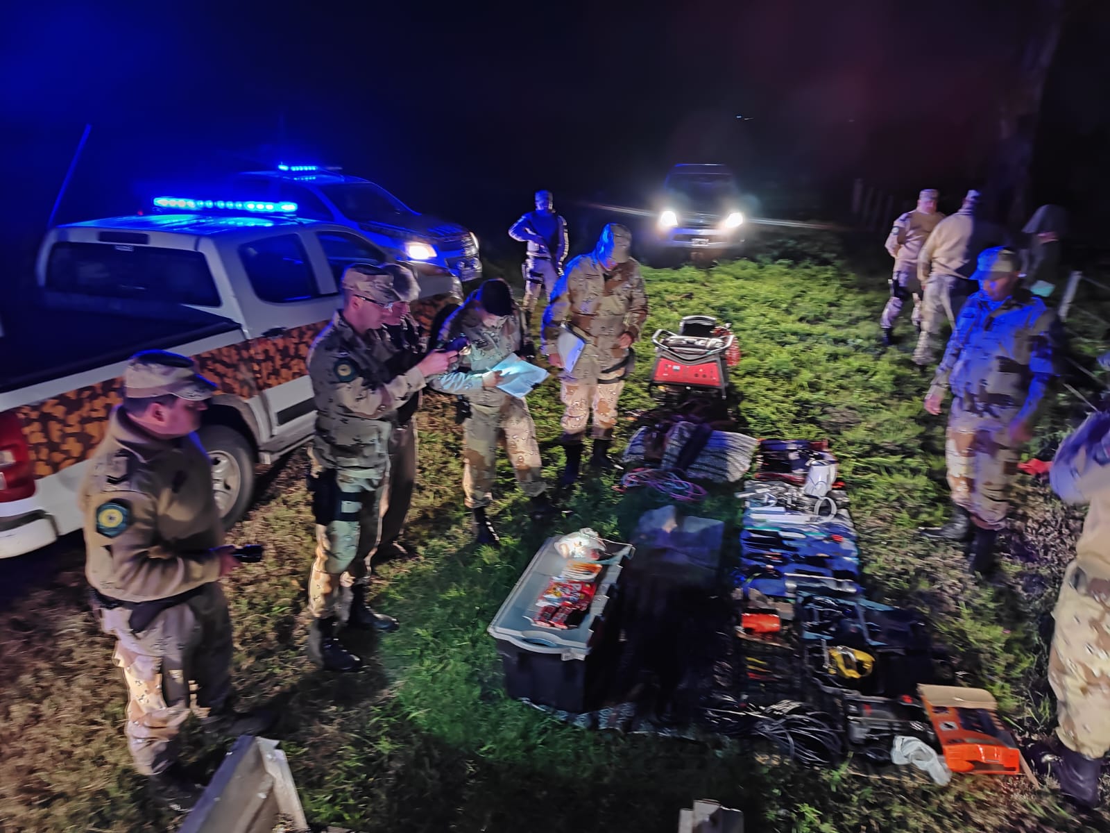 Además, se secuestró un revólver calibre 22 cargado con seis cartuchos; y del otro lado del alambrado los uniformados encontraron un acoplado con una millonaria carga de herramientas y elementos que habían sido sustraídos de la vivienda.