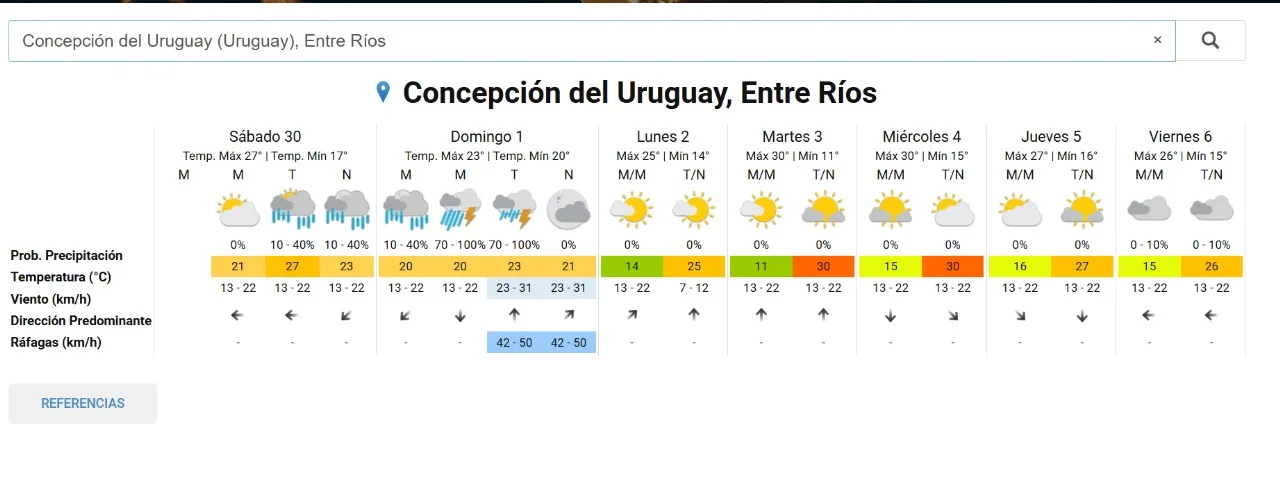 El domingo, en el inicio del último mes del año, según el SMN, la temperatura mínima sería de 20° y la máxima de 23°. Las lluvias y tormentas estarían presentes durante toda la jornada.