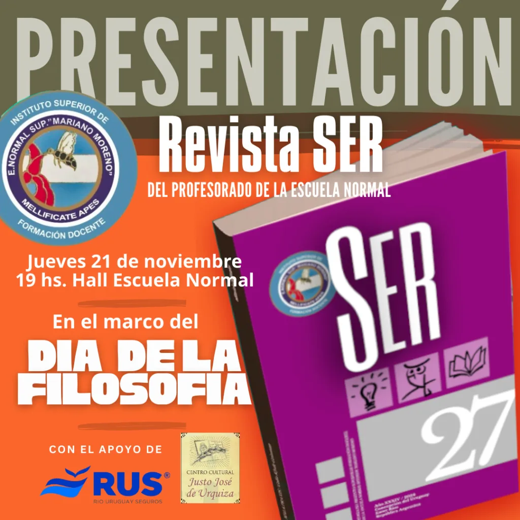 La presentación de la Revista SER tendrá lugar el jueves 21 de noviembre a las 19 horas en el Hall de la Escuela Normal. Este evento se enmarca en la conmemoración del Día de la Filosofía.