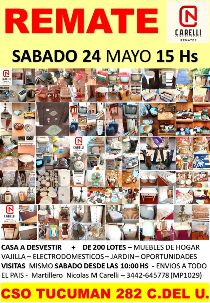 Los elementos podrán pasar a verse por Congreso de Tucumán 282 desde las 11hs. empezando el remate a las 15hs.