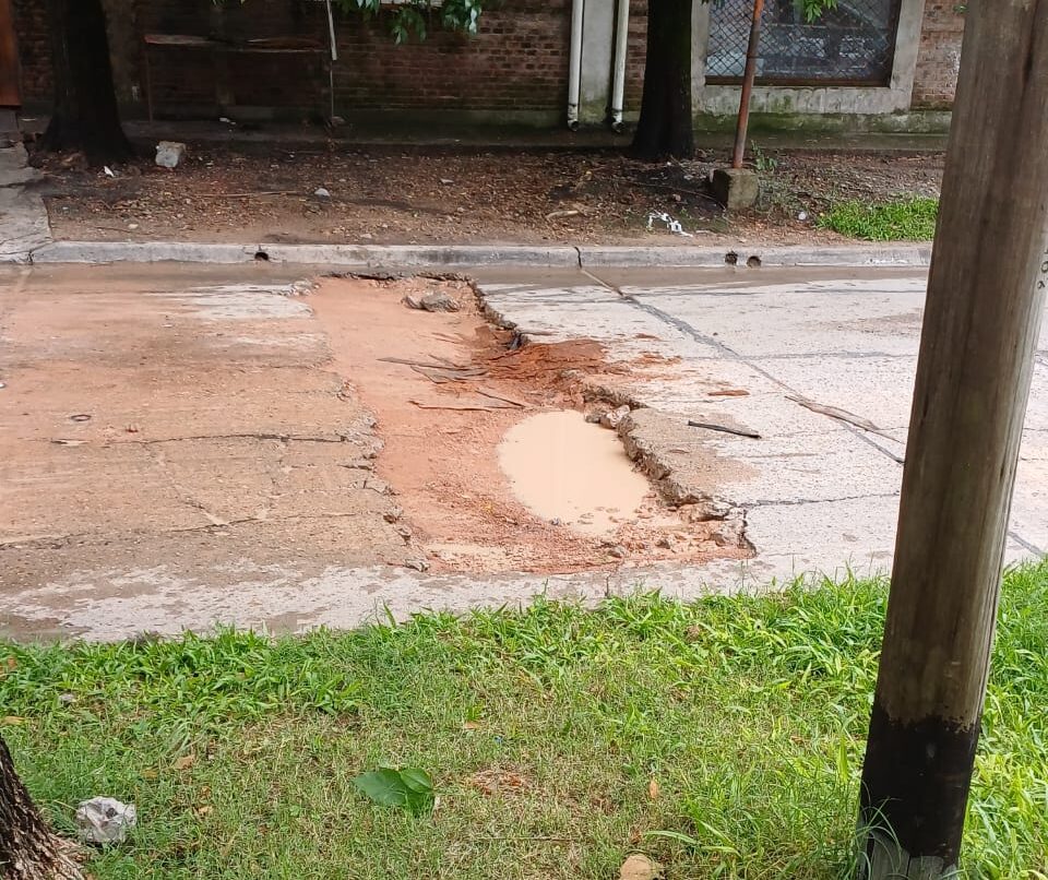 Vecinos que viven en calle San Martín, a la altura del 1600, reclaman el arreglo de un bache en el pavimento, que ocupa el ancho de la calle y genera importantes inconvenientes para transitar.