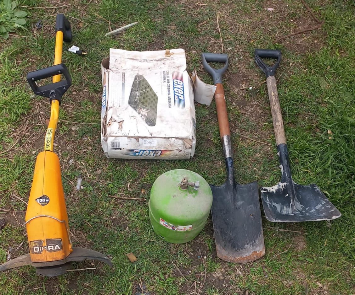 Personal policial de la División de Investigaciones secuestró dos palas, un tubo de garrafa verde de 5 kg de la marca Vali Cas, un colchón inflable de dos plazas marca Exxer y una bordeadora de la marca Dibra que estaban abandonados en una vivienda deshabitada en Supremo Entrerriano y Teniente Ibáñez.