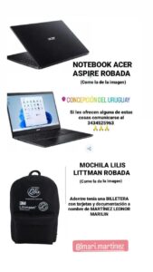 De este modo, la mujer indicó que «me robaron hoy entre las 13:00 y 14:00 horas en calle Luis Grianta al 700, las cosas que se llevaron fueron una notebook negra marca Acer Aspire 3 y una mochila negra Marca Lilis Littman, adentro tenía mi billetera (rosada tornasol) con tarjetas y mí DNI a nombre de Leonor Marilin Martínez».