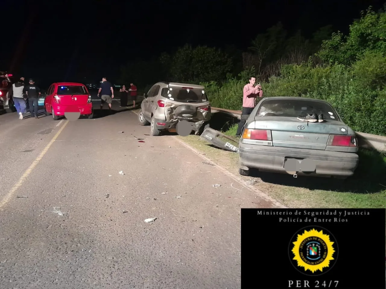 Durante la interrupción del tránsito, un Toyota Tercel, conducido por un hombre de 37 años de nacionalidad uruguaya, impactó violentamente desde atrás a una camioneta Ford Eco Sport. Esta última era manejada por una mujer mayor de edad, quien viajaba con su esposo de 45 años y su hija de 12 años. El impacto provocó que la camioneta también colisionara con un Hyundai I10, color rojo, en el que viajaban un hombre de 44 años, su pareja de 48 años y su hijo de 24 años, todos oriundos de Paysandú.
