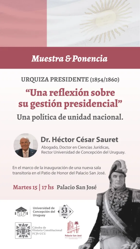 La Dirección del Palacio San José, Museo y Monumento Histórico Nacional Justo José de Urquiza, organiza una jornada de «Muestra y Ponencia», que estará a cargo del Dr. Héctor César Sauret, rector de la Universidad de Concepción del Uruguay.