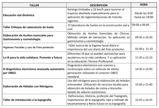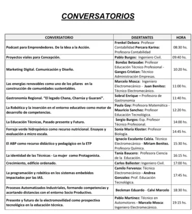 Entre las propuestas de conversatorios están proyectos viales para la ciudad, marketing digital, energías renovables, historia de las escuelas técnicas, procesos automatizados industriales, higiene y seguridad laboral y elaboración de helados con nitrógeno, entre otros.