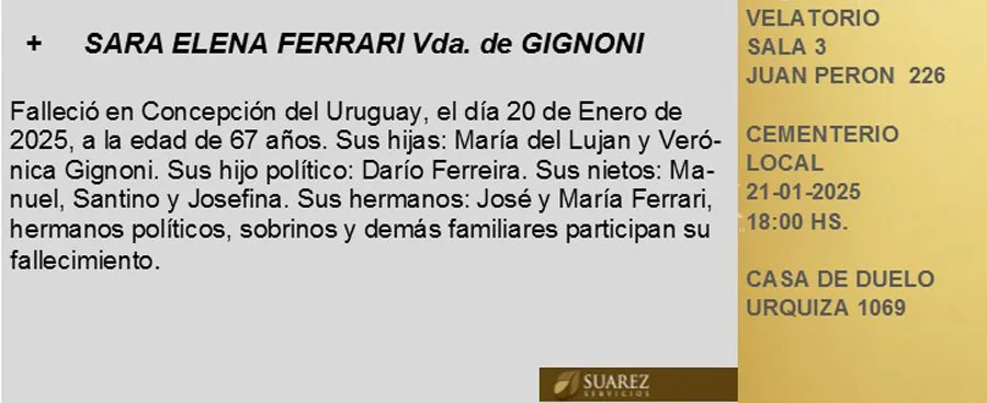 Sala de velatorios: ALBERDI 563. Concepción del Uruguay, Entre Ríos, 18 de agosto de 2025. Servicio: PREVISION CASA CEVEY S.R.L. ALBERDI 563. Teléfono: 03442-427086.