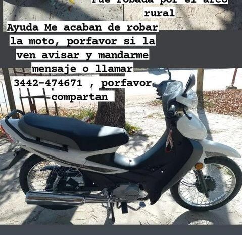 Es un rodado marca Corven blanca que fue robada este miércoles en inmediaciones del arco de La Rural. Por información comunicarse al 3442 474671.