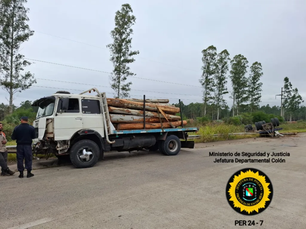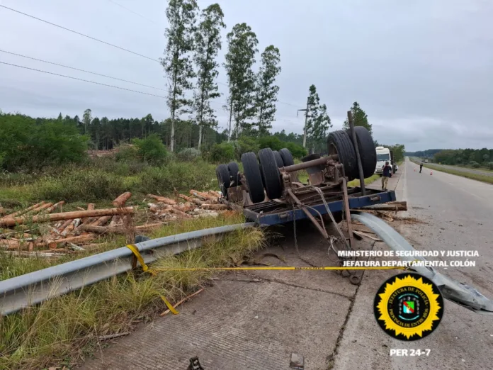 Ocurrió a la altura del kilómetro 190. Luego de chocar a un camión marca Scania, el vehículo salió del asfalto y volcó el semirremolque con la carga de eucalipto. No hubo personas lesionadas.