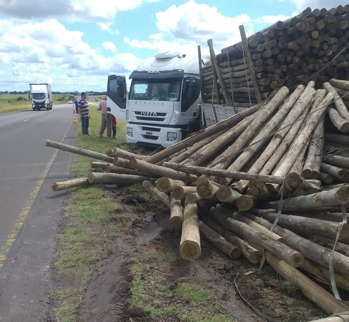 Un camión marca Iveco cargado de palos que circulaba en sentido Norte-Sur a la altura del kilómetro 118 de la Autovía Artigas, despistó y volcó a las 15:00 de este viernes.