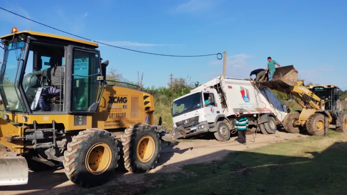 Este jueves por la mañana, el camión municipal recolector de residuos ingresó a trabajar al barrio y cayó en un bache que producto de los destrozos ya es una zanja muy pronunciada.