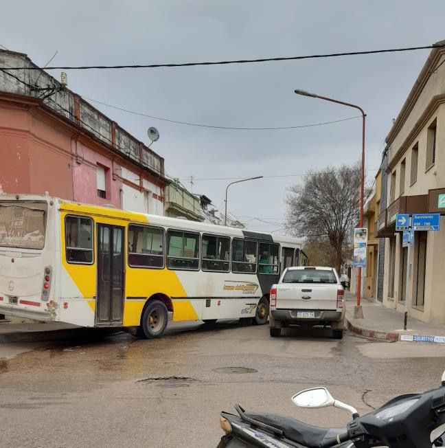 Este viernes por la mañana en la esquina de Juan Perón y Sarmiento, un colectivo de la línea 4 debió realizar una mala maniobra debido a que una camioneta estaba estacionada en su parada correspondiente.