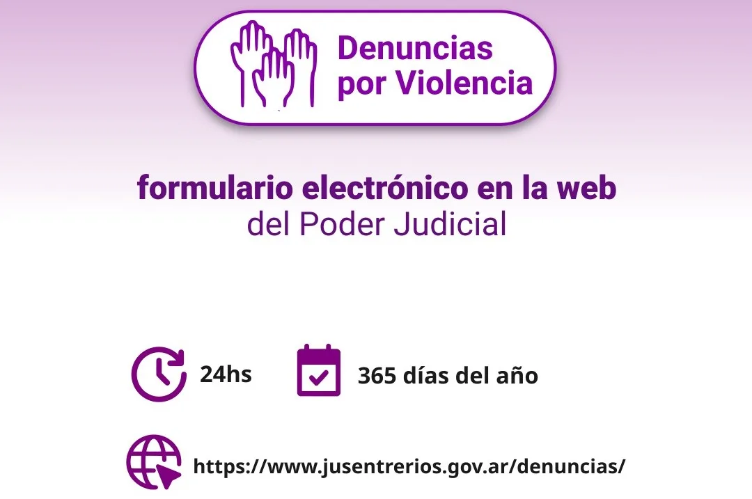 Con el objetivo de facilitar el acceso a la justicia a personas víctimas de violencia, el Poder Judicial de Entre Ríos posibilitó, desde 2020, la realización de denuncias desde cualquier dispositivo con conexión a internet. Para utilizar esta herramienta deben dirigirse a la página del Poder Judicial, www.jusentrerios.gov.ar a través del enlace https://www.jusentrerios.gov.ar/denuncias/
